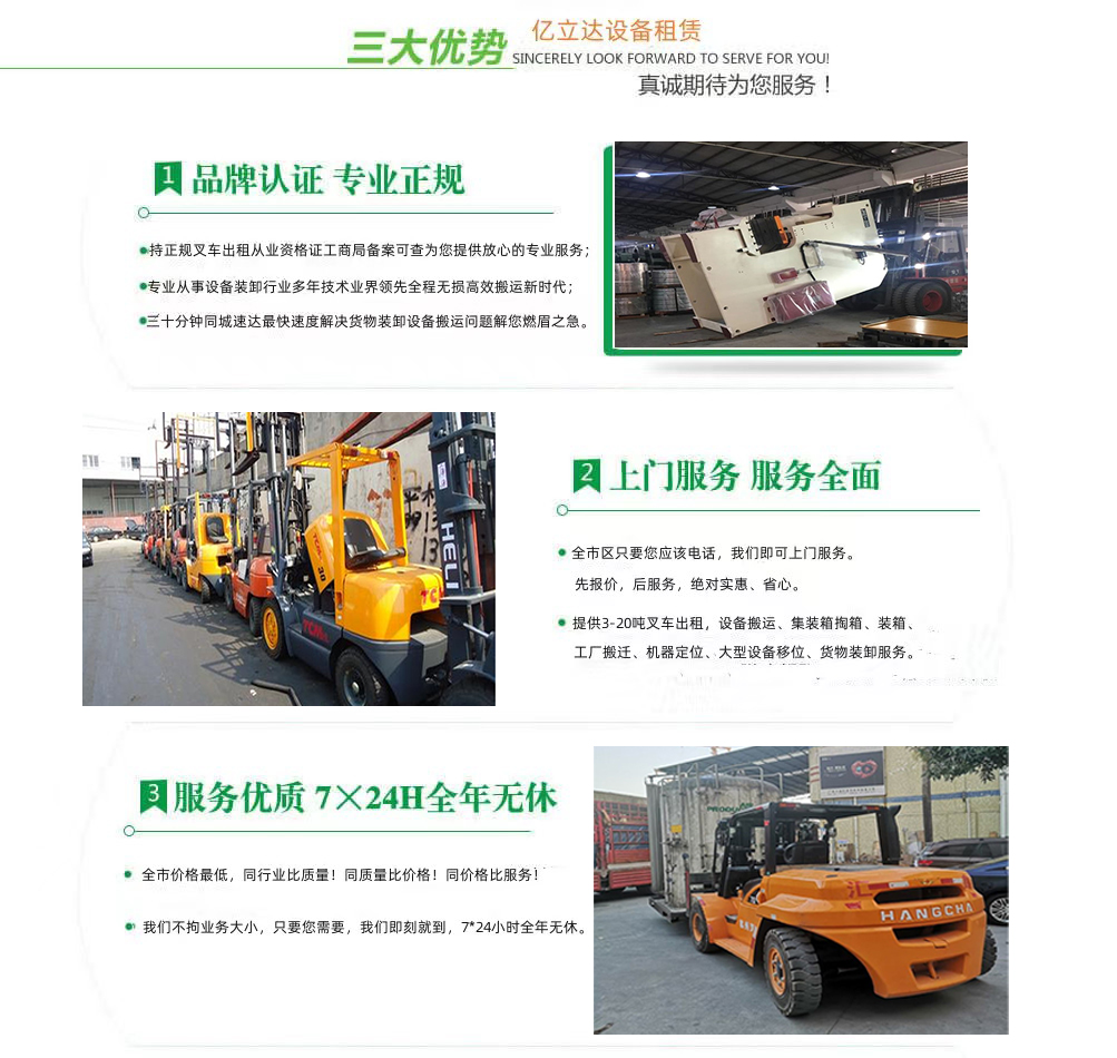 亿立达设备租赁有限公司是工商局准许的深圳福永专业叉车出租公司,公司本着诚信、服务、效率、创新的经营理念,用精湛的技术,真诚的服务,为众多客户提供优质的服务,同时获得信赖与支持。专业提供深圳福永3-20吨叉车出租、叉车租赁、设备搬运、集装箱掏箱装箱、机器移位定位、货物装卸、工厂搬迁、安全可靠,收费透明,价格便宜,随叫随到,24小时上门服务!本公司叉车吊车师傅对各种设备搬运装卸都有深刻探讨和研究。很多的疑难设备搬运,通过我公司的叉车师傅都能迎刃而解。对各种进口设备、国产机器、大型设备搬迁、高难度搬迁、各种精密仪器、医疗设备、科研设备等都能搬运; 提供全市 24 小时上门装卸搬运服务。同时提供厂房搬迁服务。 ...